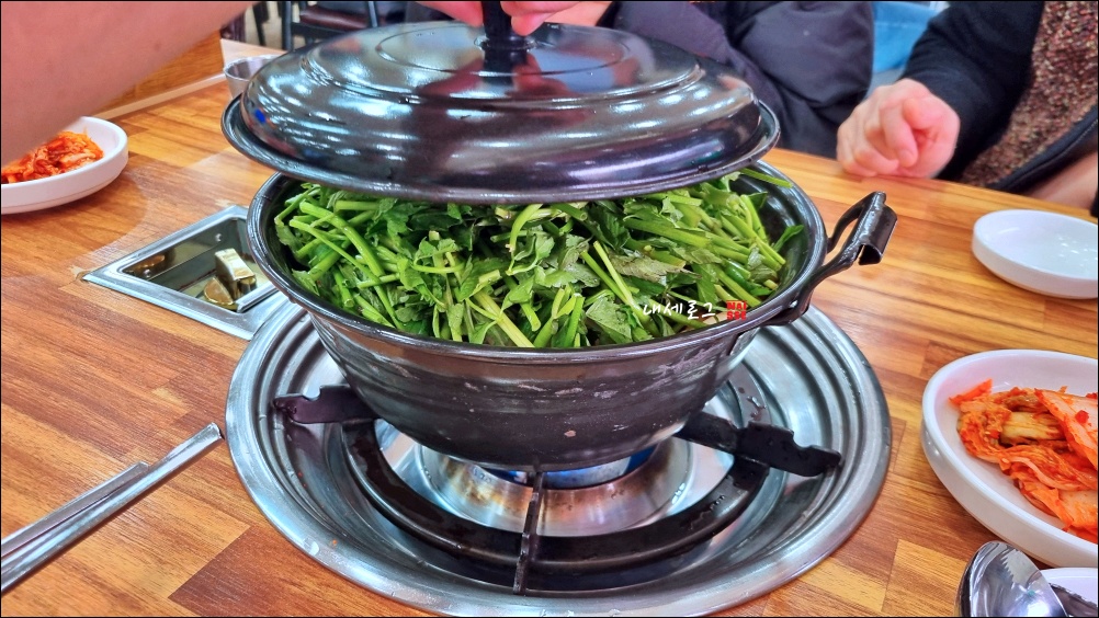 미나리 듬뿍한 버섯매운탕 칼국수가 도착했고 지글짝 보글짝 지글보글 짝짝~~~