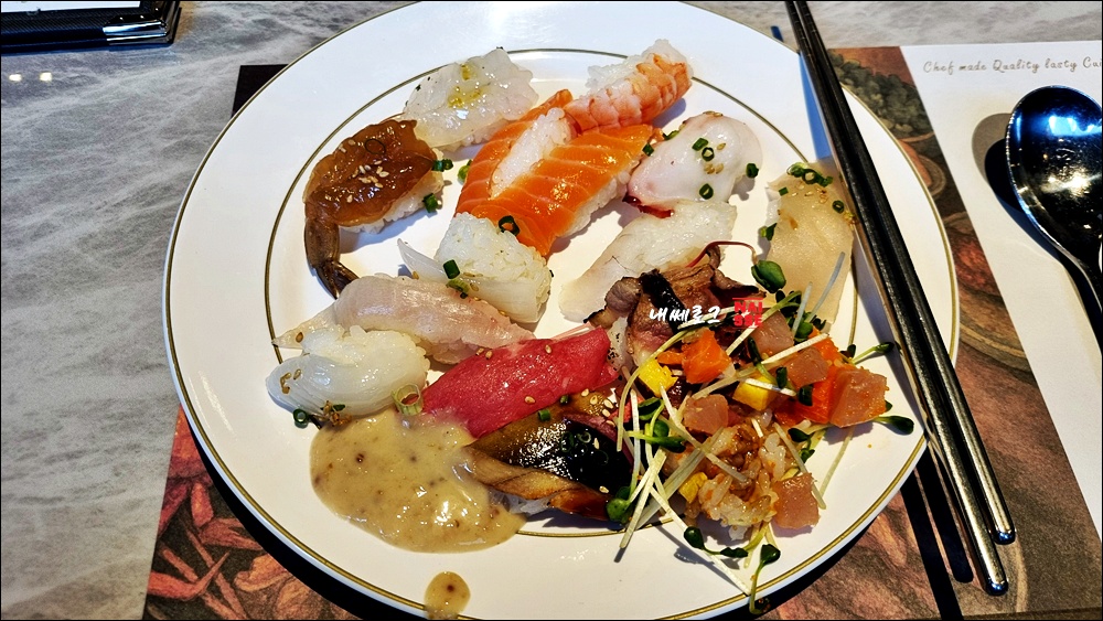 여기에서 우측으로 돌아가면 많은 분들이 즐겨하는 샐러드와 초밥, 롤이 다양하게 준비되어 있다.(아래 이미지)